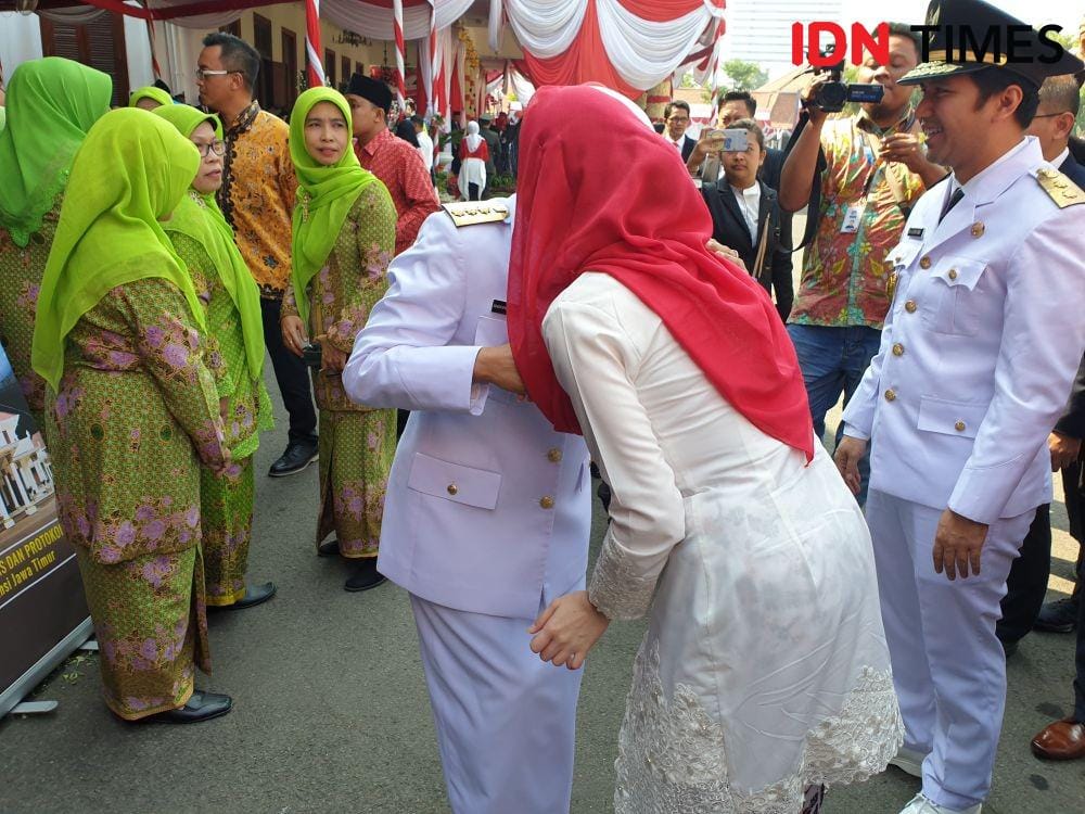 Surabaya, IDN Times- Upacara perayaan Hari Kemerdekaan Republik Indonesia ke-74 berlangsung di Gedung Grahadi, Surabaya, Sabtu (17/8). Menjelang apel yang diagendakan berlangsung pada pukul 10.00 WIB, para tamu undangan yang terdiri bupati dan wali kota se-Jawa Timur, veteran perang, bersama warga telah memadati lokasi acara.