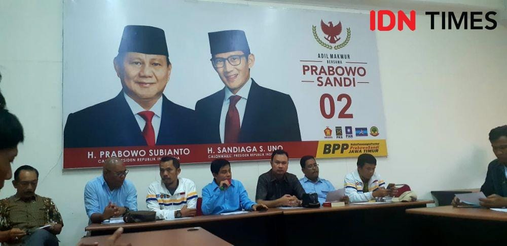 Surabaya, IDN Times - Ketua Badan Pemenangan Provinsi (BPP) Jawa Timur (Jatim), Supriyatno mengklaim bahwa Prabowo-Sandiaga Uno sudah menang dalam Pilpres 2019. Klaim itu berdasarkan data internal Badan Pemenangan Nasional (BPN).